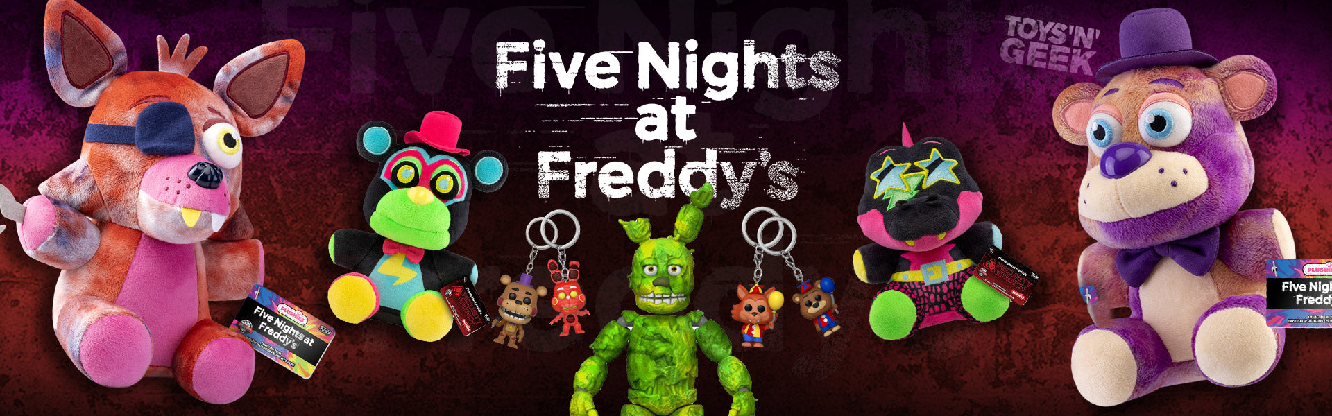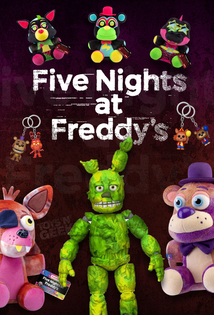 We have 100's of Five Nights at Freddy's items, including: Plush Toys, Figures, Pops, Keychains.