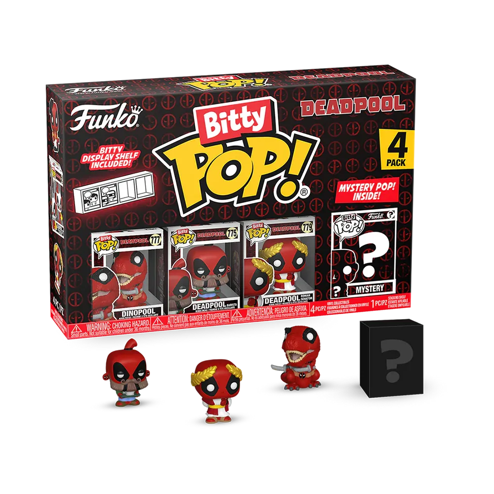This 4-pack includes Bitty Pop! Dinopool, Bitty Pop! Deadpool (Barista), Bitty Pop! Deadpool (Roman Senator), and a mystery Bitty Pop! figure. The possible mystery Bitty Pops! are Rare (1/3) Deadpool (Lederhosen), Rare (1/3) Deadpool (Beauty Pageant), Hyper Rare (1/6) Deadpool (Tourist), and Hyper Rare (1/6) Deadpool (French Maid).