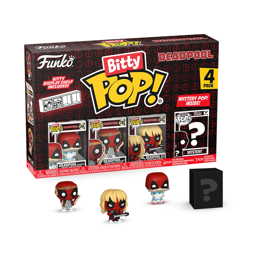 This 4-pack includes Bitty Pop! Deadpool (Sleepover), Bitty Pop! Deadpool (Larp), Bitty Pop! Deadpool (Heavy Metal), and a mystery Bitty Pop! figure. The possible mystery Bitty Pops! are Rare (1/3) Deadpool (Lederhosen), Rare (1/3) Deadpool (Beauty Pageant), Hyper Rare (1/6) Deadpool (Tourist), and Hyper Rare (1/6) Deadpool (French Maid).
