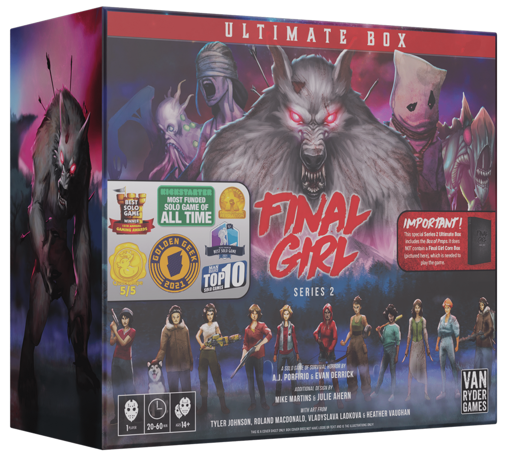Even more horror awaits! this massive box contains the Box of Props, Game Mat box, and the Series 2 collection of Feature Film boxes for the critically acclaimed solo game FINAL GIRL. Plus, also included inside are the miniatures and bonus content for Series 2 such as the Lore and Scenario and Gruesome Death books!