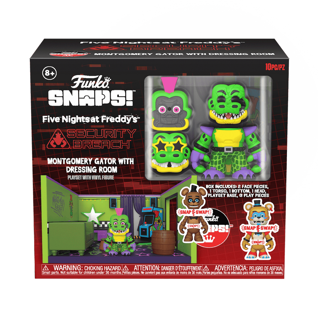 Rock ‘n roll with SNAPS! Montgomery Gator his Dressing Room Playset! The Dressing Room Playset with Montgomery Gator comes with 10 customizable pieces, including 2 face pieces, 1 torso, 1 pair of legs, 1 head, 1 accessory, 3 play pieces, and 1 playset base. The play pieces include a table, couch, and barrel, which can all be moved to customize each playset.