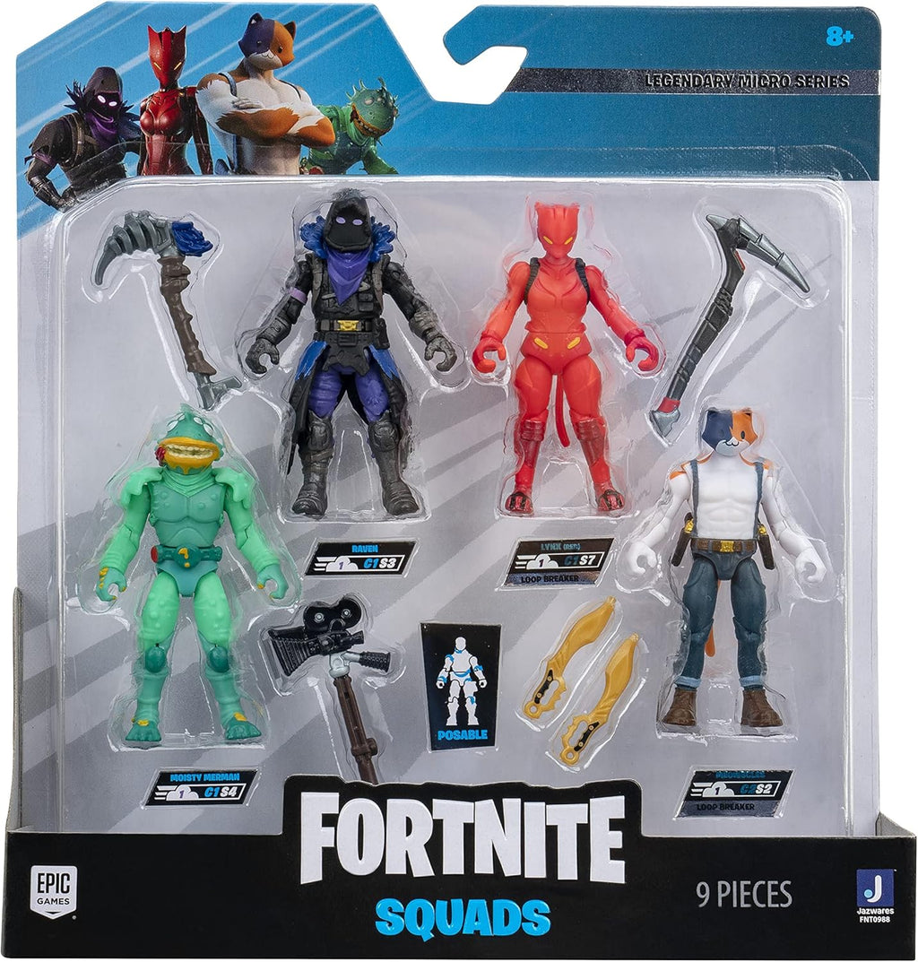 Grab your squad and beat the odds with this Fortnite four figure multipack! These highly articulated 2.5-inch figures are fully kitted with everything they’ll need to get the victory royale. Featuring Raven, Meowscles, Moisty Merman, and Red Lynx, this team can easily lay out the entire lobby. They’re also armed with Harvesting Tools to accumulate mats and outbuild any opponent. Although they fight as a unit, each one can team up with any other Fortnite figure so squad up and build your collection!