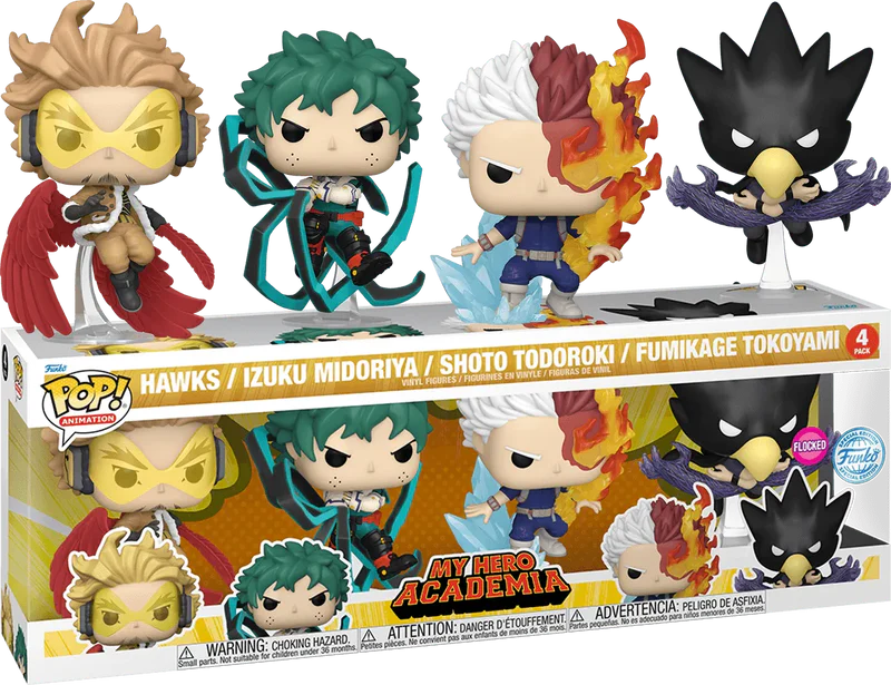 • Includes Hawks (Flocked), Izuku Midoriya, Shoto Todoroki, Fumikage Tokoyami POPs.