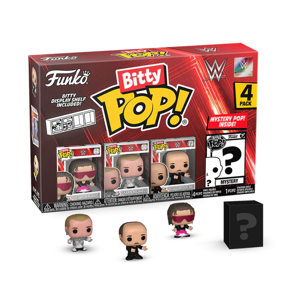 Your favourite WWE Pops! have been shrunk into Bitty Pops! Expand your collection with this assortment of Bitty Pop! figures featuring some of the most legendary names in WWE as miniaturized figures! This 4-pack includes Bitty Pop! Bret “Hit Man” Hart™, Bitty Pop! Shawn Michaels, Bitty Pop! “Mean” Gene Okerlund™, and a mystery Bitty Pop! figure. The possible mystery Bitty Pops! are Hyper Rare (1/6) Triple H (Skull King), Hyper Rare (1/6) “Macho Man” Randy Savage, Rare (1/3) Dwayne “The Rock” Johnson, and Rare (1/3) “Stone Cold” Steve Austin™.