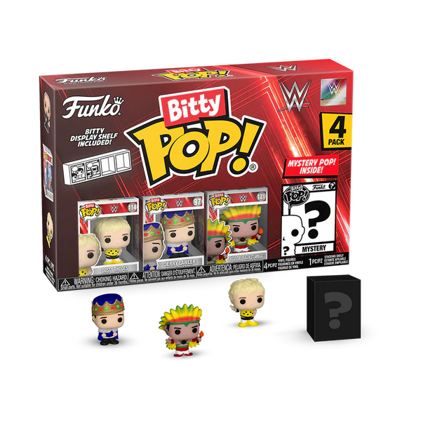 Your favorite WWE Pops! have been shrunk into Bitty Pops! Expand your collection with this assortment of Bitty Pop! figures featuring some of the most legendary names in wrestling as miniaturized figures! This 4-pack includes Bitty Pop! Dusty Rhodes, Bitty Pop! Jerry Lawler®, Bitty Pop! Ricky the Dragon Steamboat, and a mystery Bitty Pop! figure. The possible mystery Bitty Pops! are Hyper Rare (1/6) Triple H (Skull King), Hyper Rare (1/6) Hulk Hogan, Rare (1/3) Dwayne “The Rock” Johnson, and Rare (1/3) “Stone Cold” Steve Austin™.