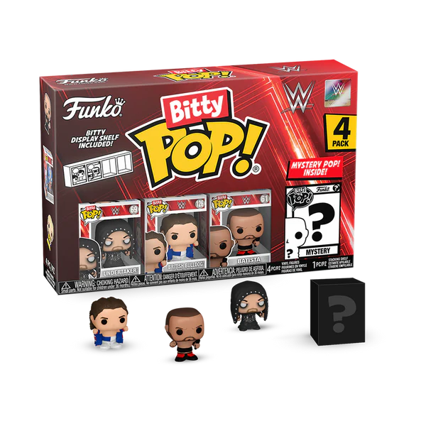 Your favorite WWE Pops! have been shrunk into Bitty Pops! Expand your collection with this assortment of Bitty Pop! figures featuring some of the most legendary names in wrestling as miniaturized figures! This 4-pack includes Bitty Pop! The Undertaker, Bitty Pop! British Bulldog™, Bitty Pop! Batista, and a mystery Bitty Pop! figure. The possible mystery Bitty Pops! are Hyper Rare (1/6) Triple H (Skull King), Hyper Rare (1/6) Hulk Hogan, Rare (1/3) Dwayne “The Rock” Johnson, and Rare (1/3) “Stone Cold” Steve Austin™.